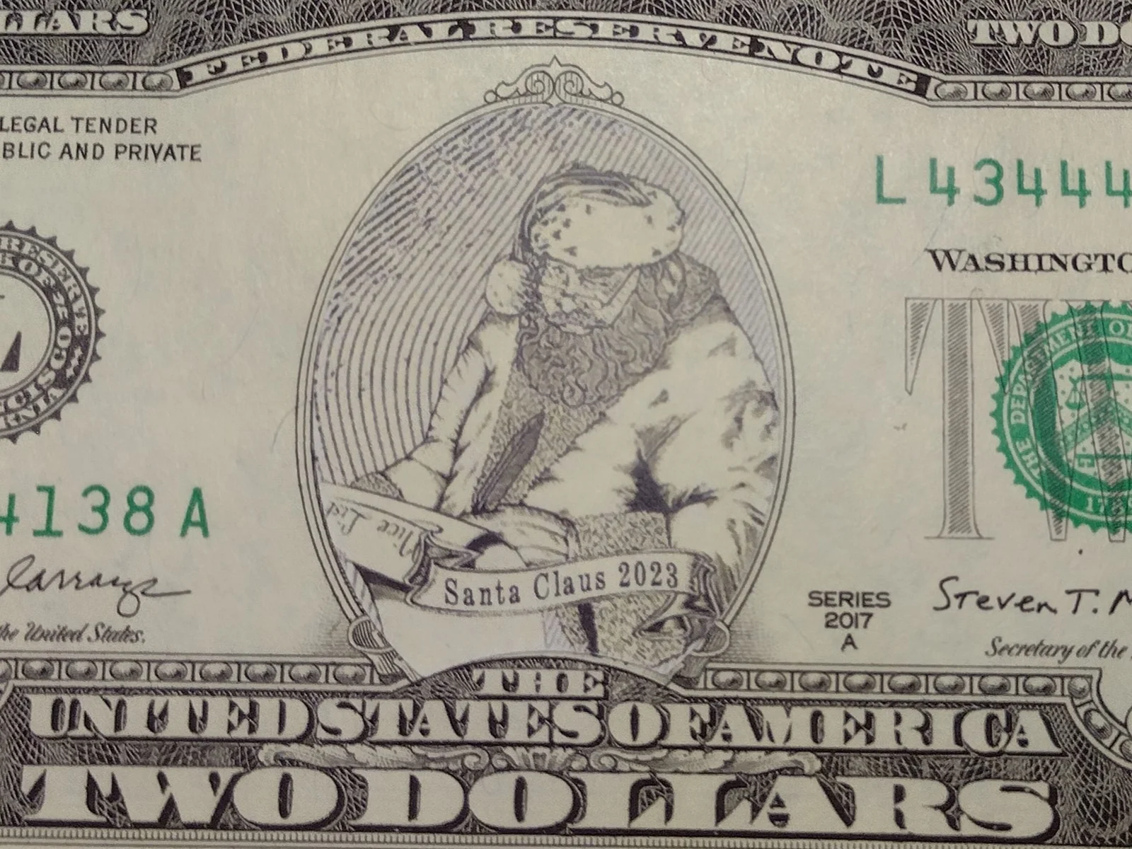 Kids of all ages love these fun dollars! They are real, spendable US currency that have been made especially for Santa with special seals placed over George Washington on a new, crisp US $2 bill. They are legal tender if your child absolutely has to spend it (you can take the seal off, if necessary) although most kids tend to keep theirs. They each come with their own money holder card, in their own gift envelope.